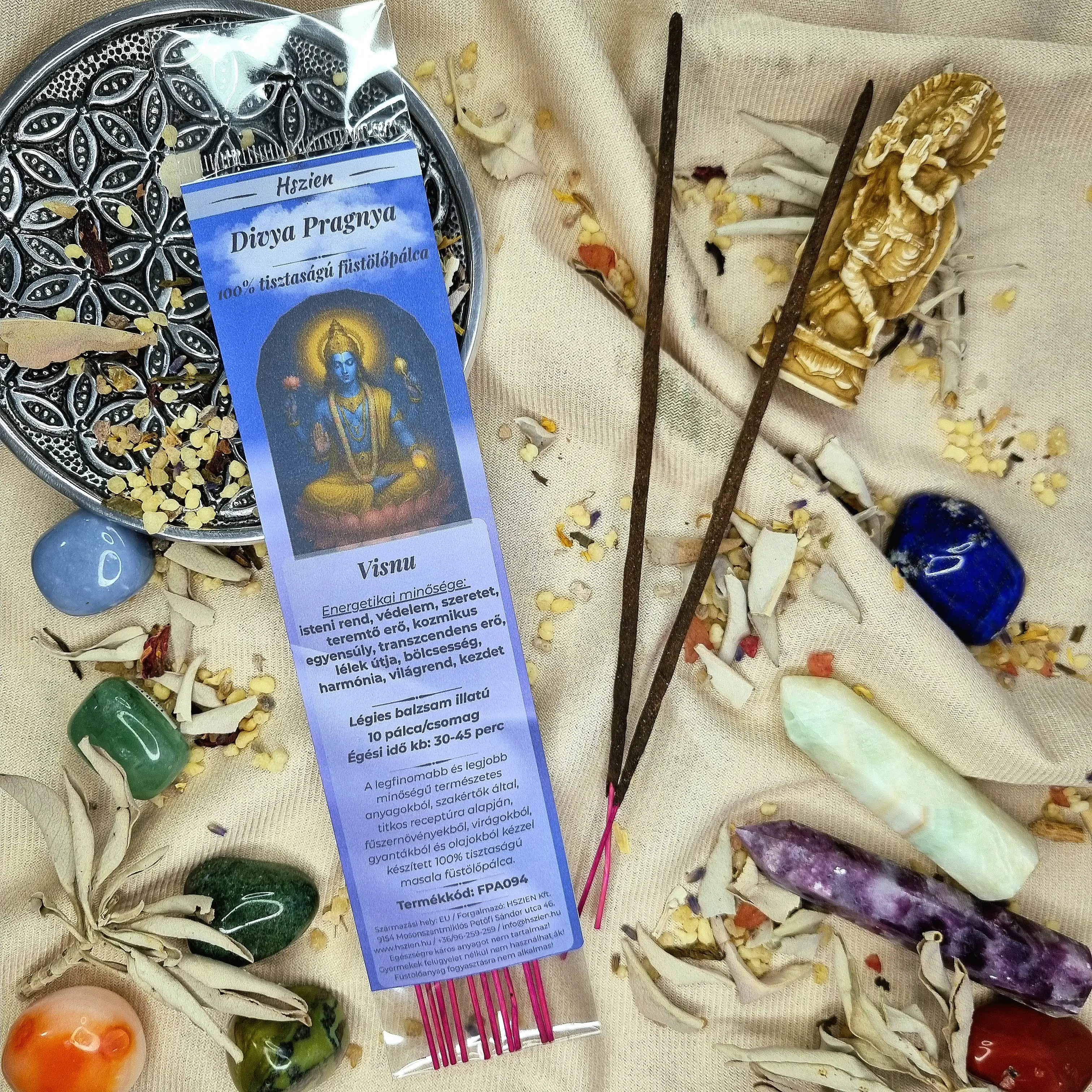A Divya Pragnya, azaz „Isteni Bölcsesség” illatsorozat olyan különleges illatkompozíciókat ölel fel, melyek az indiai hitvilág isteneihez és istenségeihez kapcsolódnak. Minden egyes illat a magas rezgésű, égi erőket és energiákat hivatott bevonzani, melyek harmóniába hozzák az elmét, a lelket és a szellemet. Az ahimszá, vagyis a nem ártás elvének energiája minden darabjában jelen van, ez az erő segít abban, hogy életedben a béke, a tudatosság és a szeretet energiái egyre mélyebben gyökerezzenek. A sorozat minden illata egy-egy isteni minőséghez kapcsolódik, így különleges módon támogatja a tudatosság elmélyítését, a manifesztáció erejének felébresztését, a transzcendenciát és a lelki fejlődést. A Divya Pragnya illatok nem csupán illatok, hanem energetikai hidak, melyek összekapcsolják a földi valóságot az isteni szférák fényével, megnyitva az utat a belső béke, a tiszta szellemi látás és a magasabb tudatosság felé.