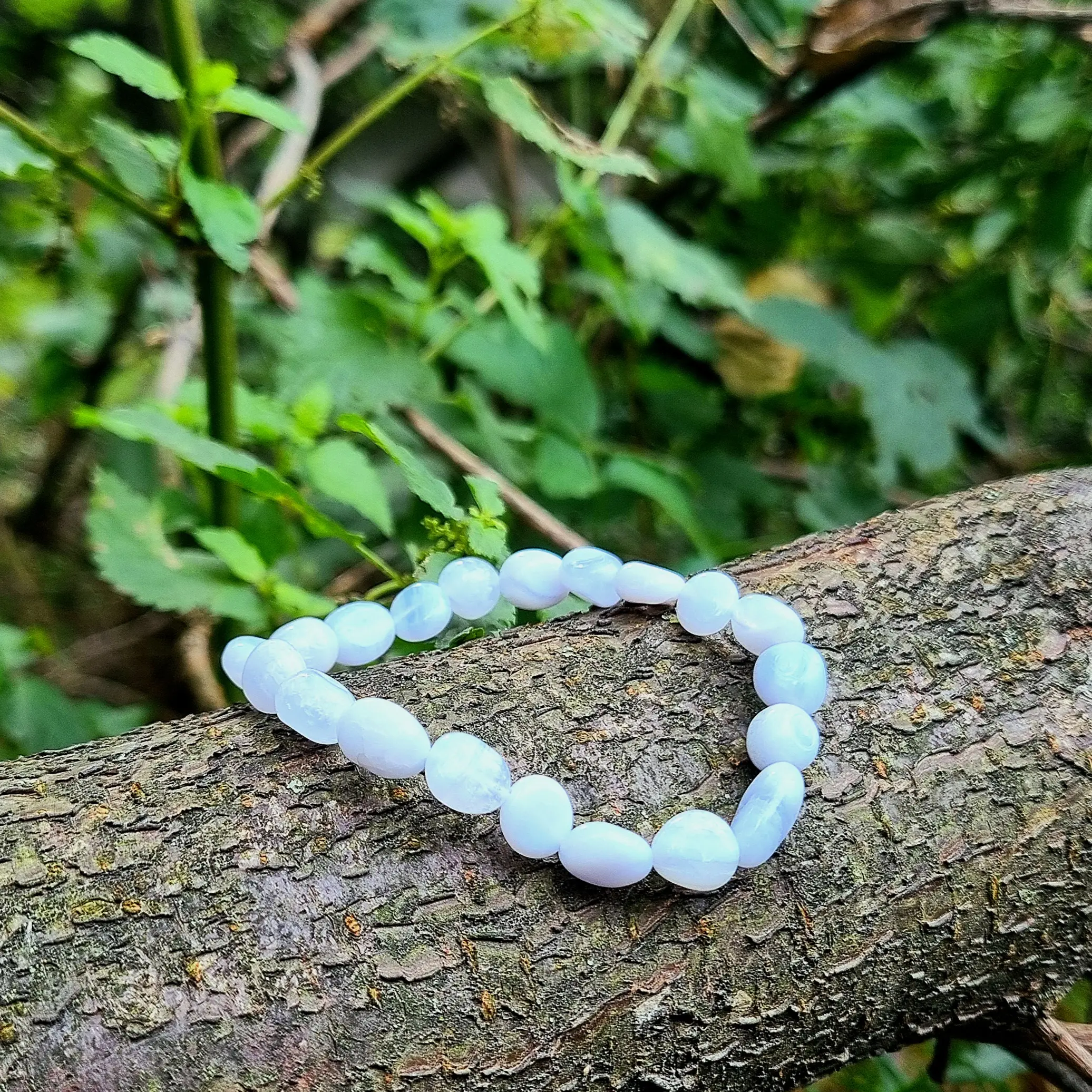 kék kalcedon a kreativitás egyik alapvető köve. Segít, hogy megnyíljon az elme és képes legyen új látásmódokat és ötleteket beengedni. Az egyik legkiválóbb kommunikációt segítő, képes a megfelelő energiát biztosítani és egyensúlyt beállítani ezen a területen. Így akinek szüksége van, azoknak segít hallgatni, akinek kell pedig megnyílni és beszélni. Az idegen nyelvek megtanulása is könnyebb általa. Nagyon erős az önmegfigyelő képesség erősítése és segít optimistának lenni. A kő maga erősen kötődik az időjáráshoz, így az azt irányítani próbáló szertartások alapvető eszköze. Illetve minden olyan betegséget, mely kapcsolatban van, az időjárással kiválóan gyógyít. Fizikai szinten segít a nyálkahártya, és a szem megbetegedésein, főként a zöld hályog ellen kiváló. Gyógyítja a tüdőt, főleg a dohányzás okozta problémák esetén.