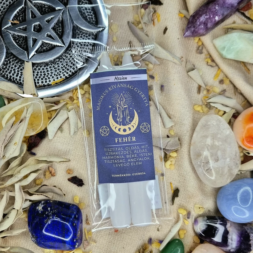 mágikus kívánság gyertya egy különleges, rituálisan megtisztított és színrezgésekhez finoman hangolt spirituális eszköz, mely a teremtés, a manifesztáció és a szándék erejét hordozza. Nem csupán gyertya, hanem egy energiahordozó kapu, amely a lángon keresztül kapcsolatba lép a finomenergiák világával, és közvetíti a benned megszülető kívánságot az univerzum felé. Belső magja színtelen, tiszta, úgynevezett nullponti energia-minőségű parafinból készült, amely önmagában semleges, így képes bármilyen szándék befogadására és felerősítésére. Külső rétegét a megfelelő színnel vontuk be, majd a gyertyát az adott szín spirituális frekvenciájához hangoltuk – így minden egyes darab önálló energetikai mintázattal és erővel rendelkezik. Amikor meggyújtod, lángja hidat képez a fizikai és a finomenergetikai síkok között, felerősítve a kimondott vagy átélt kívánság rezgését. A gyertya fénye a teremtés szimbólumaként segíti, hogy szándékaid tisztán és erővel jussanak el a mindenségbe. A mágikus kívánság gyertya ideális gyertyamágiákhoz, rituálékhoz vagy bármely olyan alkalomhoz, amikor tudatosan szeretnéd megteremteni azt, amire szíved mélyén vágysz.