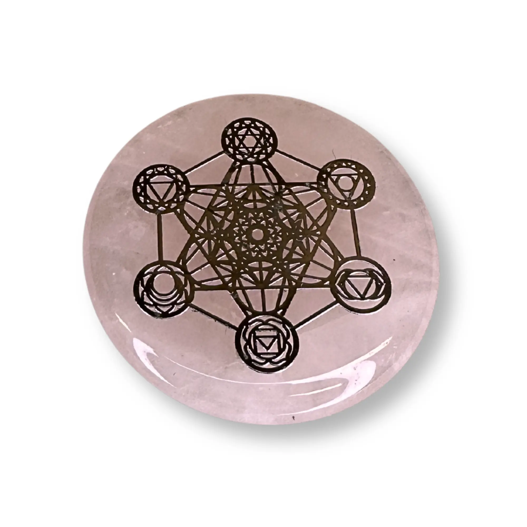 A korong felületén látható ezüst Merkaba szimbólum a szakrális geometria egyik erőteljes jelképe, amely a test, a lélek és a tudat egységét, valamint az energiák kiegyensúlyozott áramlását szimbolizálja. A rózsakvarc és a Merkaba együtt egy olyan energetikai fókuszpontot hoz létre, amely ideális meditációhoz, kristályrácsok központi elemeként vagy a tér harmonizálására, miközben elegáns és különleges megjelenést kölcsönöz a környezetnek.