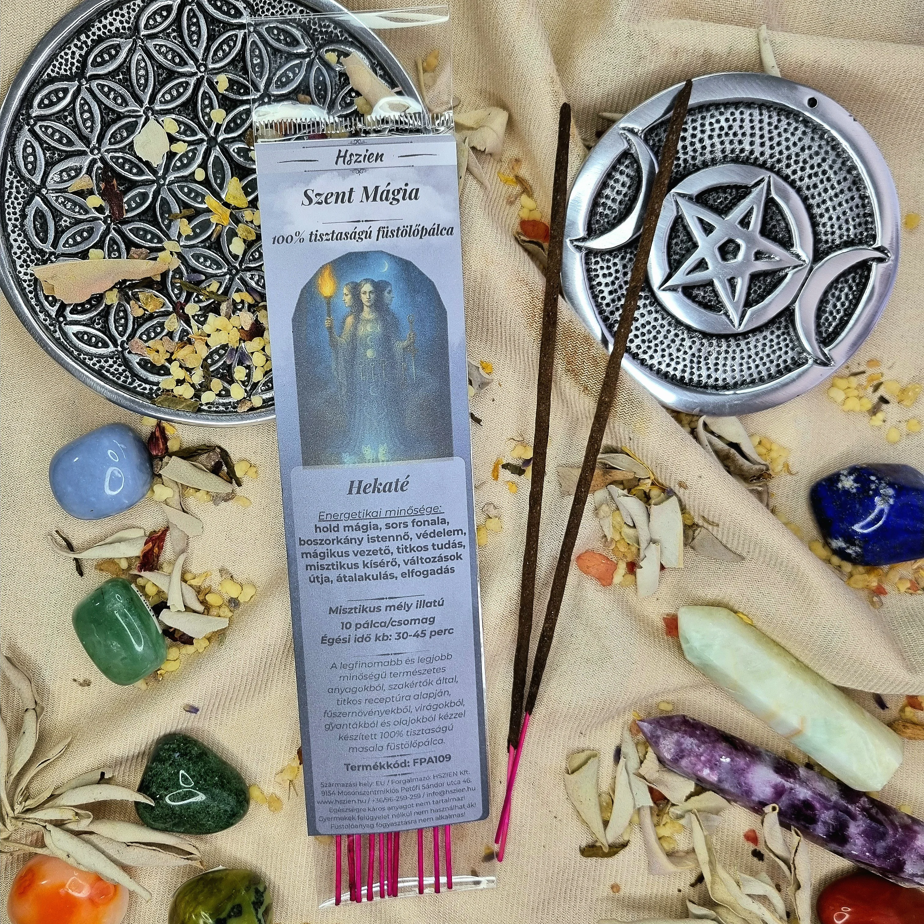 Hekaté a hold és az éjszaka mágikus istennője, a boszorkányok, gyógyítók és látók védelmezője. Ő az, aki ismeri a sors fonalát, és képes vezetni a lelket az élet és halál, a fény és árnyék határán. Energiája mély, titokzatos és transzformatív, a változások idején hívható, amikor az ember régi mintáit szeretné elengedni, hogy új útra léphessen. A háromarcú istennőként Hekaté egyszerre képviseli a múlt, a jelen és a jövő bölcsességét, s így segít megérteni életünk ciklusait és döntéseink következményeit. Az ő fénye nem vakító, hanem vezető, a sötétségben pislákoló lámpás, amely a lélek mélyéről mutatja az utat. Hekaté a belső erő, az elfogadás és a mágikus tudás istennője, aki megtanít bízni az ismeretlenben és meghallani a belső hívást. Általa megérthetjük, hogy a változás nem veszteség, hanem a beavatás kapuja, amelyen áthaladva új szintre emelkedik a tudat és a lélek. Hekaté energiája különösen erős a holdmágia, a védelem és a szertartások idején. Ő az éjszaka csendes kísérője, aki bátorságot ad a sötétben járóknak, és bölcsességével segíti a lélek újjászületését. Általa a titkok feltárulnak, az út megvilágosodik, és a bennünk rejlő isteni női erő újra életre kel.