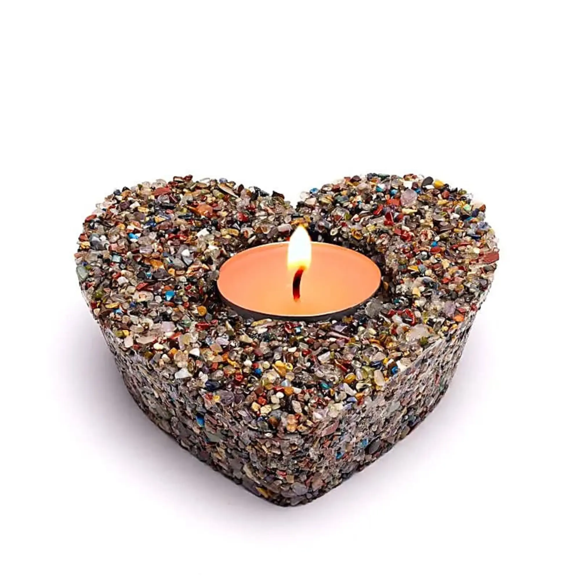 Apró szemű kristályokból készült: a parányi kristálydarabkákat gyantával öntötték össze, majd finoman a szív ikonikus formájára öntötték. A felület különlegesen rücskös, így a mécses lángja százféle kis szikrára bomlik rajta, életre keltve a kristályok természetes ragyogását. Amikor meggyújtod benne a gyertyát, a fény szinte lüktetni kezd, mintha maga a szív dobogna.
