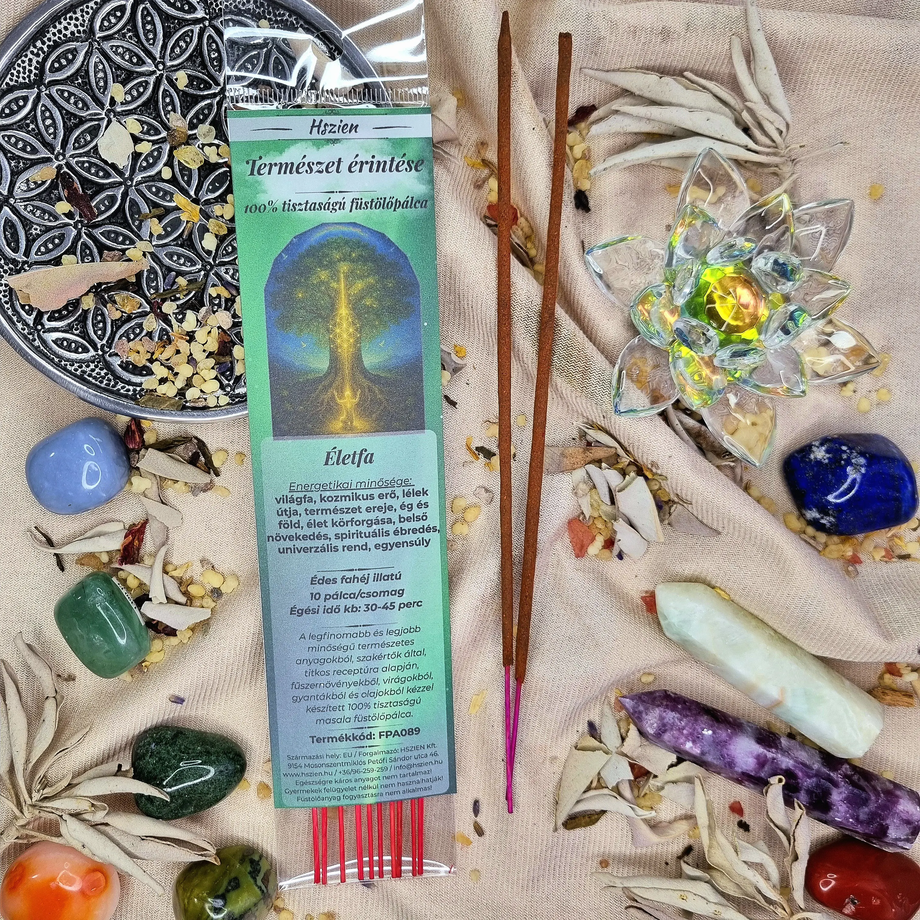 Az Életfa a világfa ősi szimbólumán keresztül a kozmikus erőket, a természet energiáit és a lélek útját képviseli. Ez a szimbólum az ég és a föld kapcsolatát testesíti meg, egyensúlyt teremtve a fizikai és a spirituális világ között, miközben az élet körforgásának folyamatát is szimbolizálja. Spirituális értelemben az Életfa az ember belső növekedését, fejlődését és spirituális ébredését segíti. Gyökerei a földbe mélyedve stabilitást, védelmet és kapcsolatot biztosítanak a kollektív tudattal, míg ágai az ég felé nyúlva az univerzális renddel és a kozmikus energiákkal hoznak kapcsolatot. Az Életfa emlékeztet minket az élet ciklikusságára, az összekapcsoltságra és arra, hogy minden tapasztalat – legyen az öröm vagy kihívás – a belső növekedésünket szolgálja. Egyben a belső egyensúly, a tudatosság és a lélek magasabb szintre emelkedésének jelképévé válik.